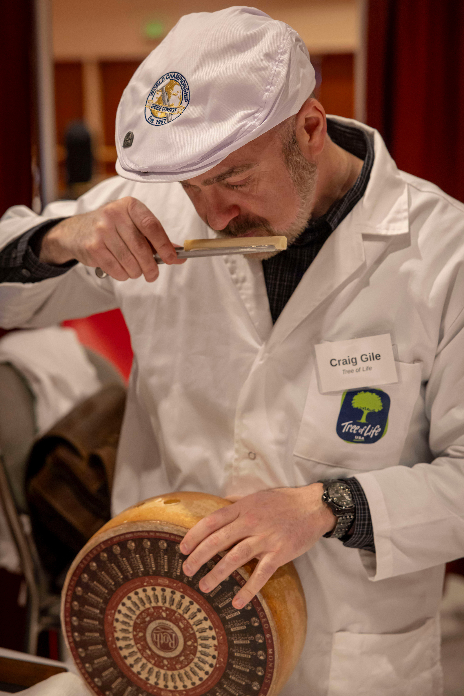 Photo Caption: 2026 World Championship Cheese Contest Judge Craig Gile analyzes Roth Grand Cru Reserve made in Wisconsin.
